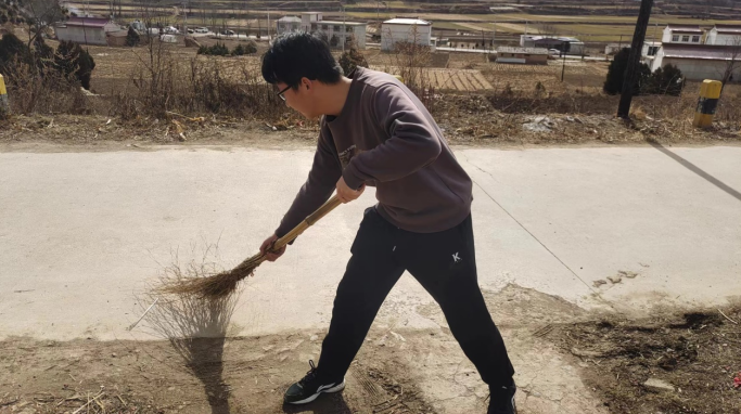 在志愿服务过程中,他首先进行了道路工作清扫,因为在新年的气氛中道路因为鞭炮爆竹等一系列污染源使得道路十分杂乱,因此他在村庄进行志愿服务,是他的家乡于庄村变得在新年过程中不仅气氛热闹而且景色更加美丽。