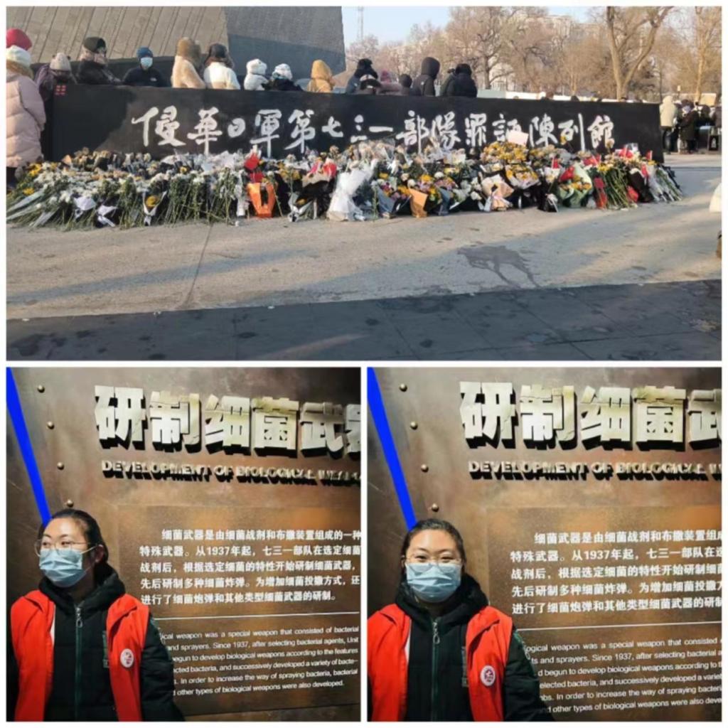 在1月14日--1月29日期间机器人232班王心妍同学参加了共青团哈尔滨平房区委员会组织的“哈尔滨市侵华日军第七三一部队罪证陈列馆志愿服务活动”,主要任务就是秩序维护和宣传七三一部队罪证陈列馆,并且可以锻炼自己的能力,丰富业余生活,让更多的中国同胞知道七三一部队罪证陈列馆。