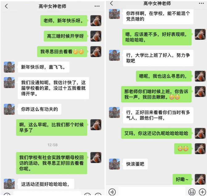 在社会实践学期第五周2月14日,机电系032组的盖庆洋同学进行了一次别开生面的母校回访活动。因为地区高中还未开学,盖庆洋同学巧妙地利用微信这一工具,与母校的老师进行了深入的沟通与交流。