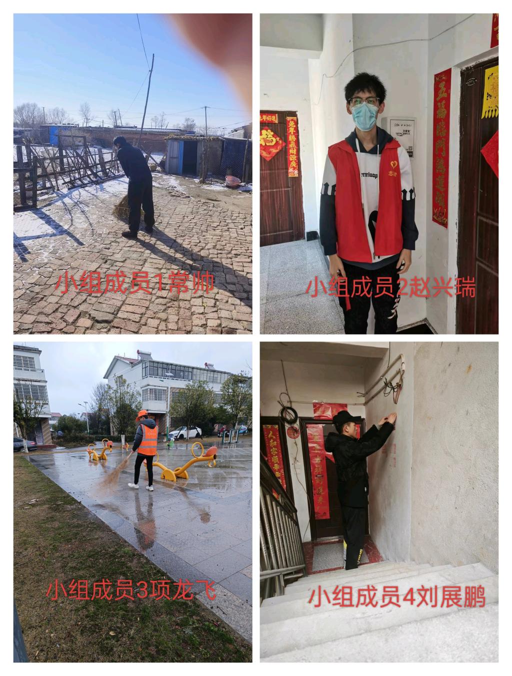 首先,我们小组组长常帅同学在发现家园垃圾站存在垃圾过多的情况,便主动志愿将家园的垃圾站附近的垃圾进行一个清扫,在打扫的同时也使家园的环境得到优良改善,既充实了自己又服务了他人。然后是我们小组成员赵兴瑞,他对家中小区邻里各个位置检查垃圾的分布情况,如有垃圾他及时的将垃圾打扫,营造了一个干净整洁的小区氛围,既充实了自己又服务了他人。然后就是我们小组成员项龙飞,他对村里公共运动设施进行一个保护性的打扫,防止村民使用运动设施发生意外,并检查设施的安全情况。最后是我们小组成员刘展鹏他对小区楼道广告进行一个清理,使小区楼道更加整洁美观。