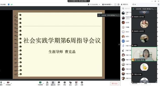 为进一步督促学生们社会实践学期任务的完成进度以及了解学生们所遇到的困难,生涯老师曹克晶于2024年2月22日晚上8时在腾讯会议召开社会实践学期第六周指导会议,要求全体学生准时参加。