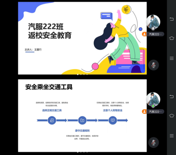 为确保学生们安全、顺利地返校,汽服222班班长王墨竹于2月27日下午18时开展返校前安全教育会议,参加会议为汽服222班全体学生。