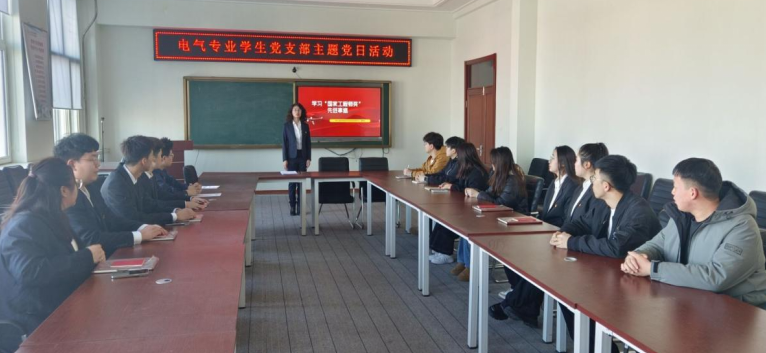 3月19日,电气专业学生党支部书记潘帝池在图书馆608组织学习国家工程师奖先进事迹,电气专业学生党支部全体党员以及积极分子代表参加。