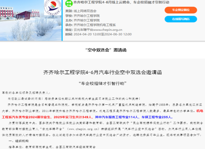 为贯彻落实党中央、国务院关于稳就业保就业决策部署和教育部、全国工商联关于“民企高校携手促就业行动”工作要求,我校联合教育部供需对接就业育人“云光车聘平台”,于2024年4月20日至6月30日组织开展“汽车行业空中双选会”活动,为汽车行业用人单位提供优质高效的人才精准对接服务。
