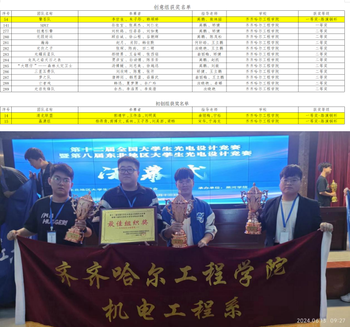 第十二届全国大学生光电设计竞赛东北区赛暨第八届东北地区大学生光电设计竞赛于6月10日至13日在黑河学院举行,东北区赛吸引了来自48所高校的1268支队伍参赛,经评审有120支队伍进入决赛路演环节,我校3支队伍入围。机电工程系电气工程及其自动化专业李世佳、朱子彤、韩顺婷的作品《“智农生辉”–农作物监测系统的引领者》荣获创意组一等奖路演铜杯;电气工程及其自动化专业郭靖宇、王传浩、刘明昊的作品《可以识别水果成熟度的智能保鲜箱》荣获初创组一等奖路演铜杯;车辆工程专业杨得青、商博文、高林、王子昂、刘昊澎、梁畅的作品《基于CC3200的无线监视系统的设计》荣获初创组一等奖路演铜杯。除此之外,还获得东北区赛一等奖1项,二等奖11项,学校荣获第十二届全国大学生光电设计竞赛东北区赛“最佳组织奖”。