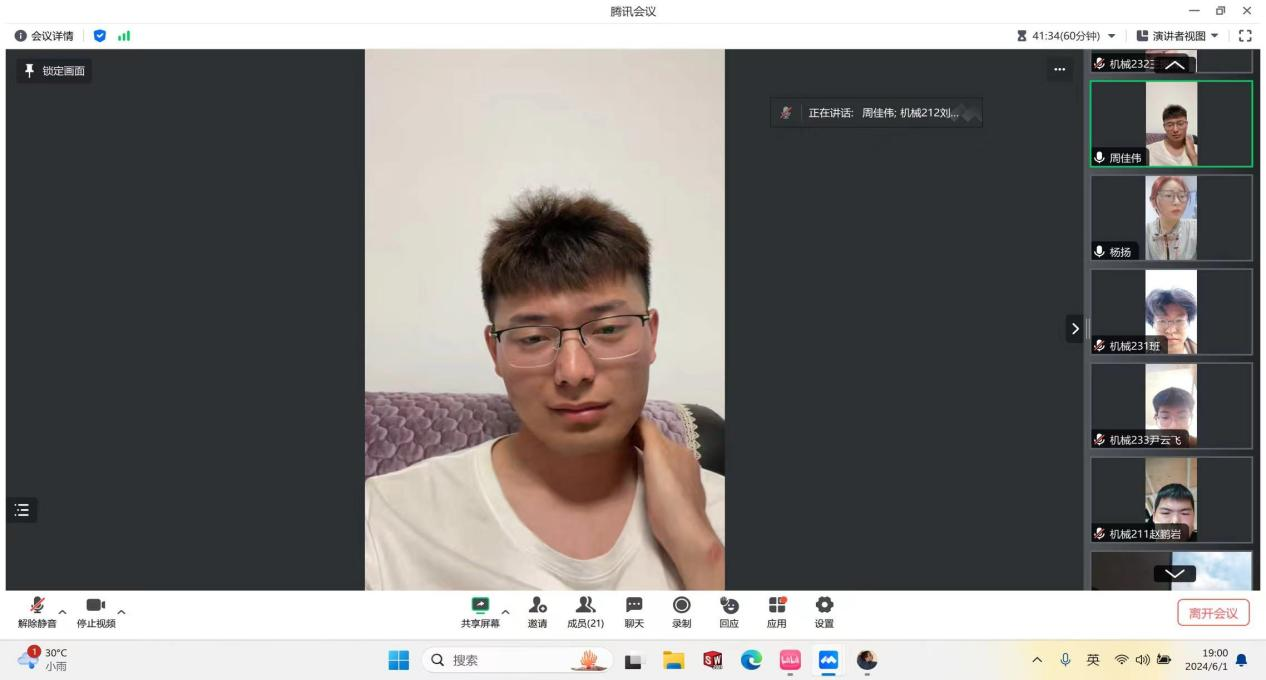 周佳伟学长介绍了自己大学生涯中,获得优秀荣誉背后的付出和努力,介绍了大学四年学的课程与目前工作岗位中的对应关系,并分享了自己在大学中学习的宝贵经验,充分认可了大学汇报给工作带来的职场帮助,并对在校的学生提出了祝福。最后,李运强老师对会议进行了总结,毕业学子校友回访,不仅是对母校的一种回馈和感恩,更是对母校的一种支持和鼓励,在校学生应该向毕业的校友学习。相信在未来的日子里,毕业生与母校“双向奔赴”,携手共进,定将共创美好明天。