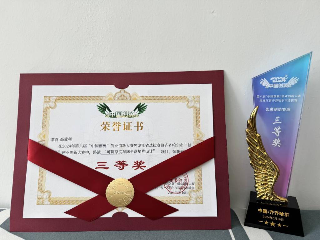 5月16日,第六届“中国创翼”创业创新大赛黑龙江省选拔赛暨齐齐哈尔“鹤创杯”创业创新大赛决赛在齐齐哈尔民生园开赛。经过激烈角逐,由我校机电工程系机械专业团队申报的可调厚度车床卡盘垫片获得先进制造组赛道三等奖。该项目团队由教师高爱利、陈博和机械专业学生马涵、林繁鹤、韩梓杨共同组成。