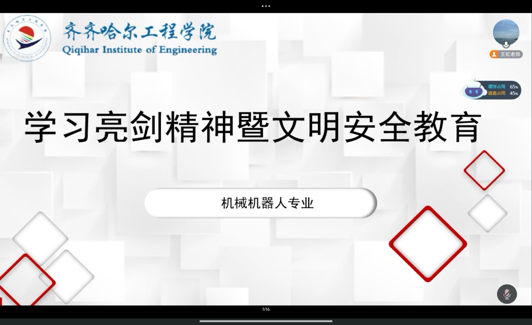 之后,王虹老师为学生们深入浅出地阐述《齐齐哈尔工程学院“亮剑”精神育人特色工作方案》:“亮剑”精神作为一种精神文化,在学校的建设过程中扎根、开花、结果。“我们面前无困难,困难面前有我们。要为成功想办法,不为失败找理由”的铮铮之志。接着王虹老师为学生们解读“亮剑”精神内涵:勇于担当,齐工程人秉承“亮剑”精神面对困难,打造丰富物质文化;勇往直前,齐工程人秉承“亮剑”精神不畏困难,打造充实行为文化;永不言败,齐工程人秉承“亮剑”精神挑战困难,打造坚实制度文化;追求卓越,齐工程人秉持“亮剑”精神战胜困难,打造深远精神文化。王虹老师说,亮剑精神不仅仅是在战场上勇往直前、敢于拼搏的勇气,更是在日常生活中面对困难和挑战时,坚定信念、永不退缩的决心,正如我们的校园文化,校外课堂,实习实践,第二课堂,积极参加技能竞赛都要克服困难,认真学习领悟体现齐工程人的“亮剑”精神。