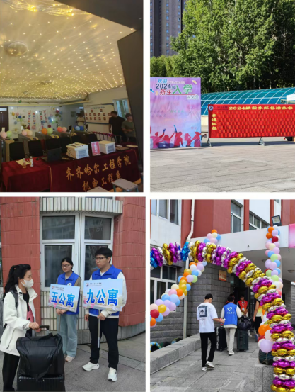 在五、九公寓门前,一个精心设计的打卡点吸引了众多新生和家长的驻足。他们纷纷在此拍照留念,记录下这难忘的一刻。五九公寓大厅内则设立了报到处和入住办理区,工作人员耐心细致地为新生们打印报到单、办理入住手续。整个迎新现场氛围浓厚、秩序井然,让新生们感受到了家的温暖和学校的关怀。