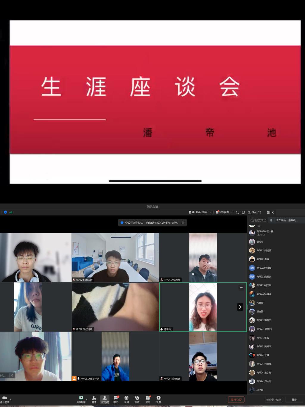9月21日,电气专业生涯导师潘帝池在腾讯会议平台主持了一场线上生涯座谈会,全体生涯学生参与了此次会议。
