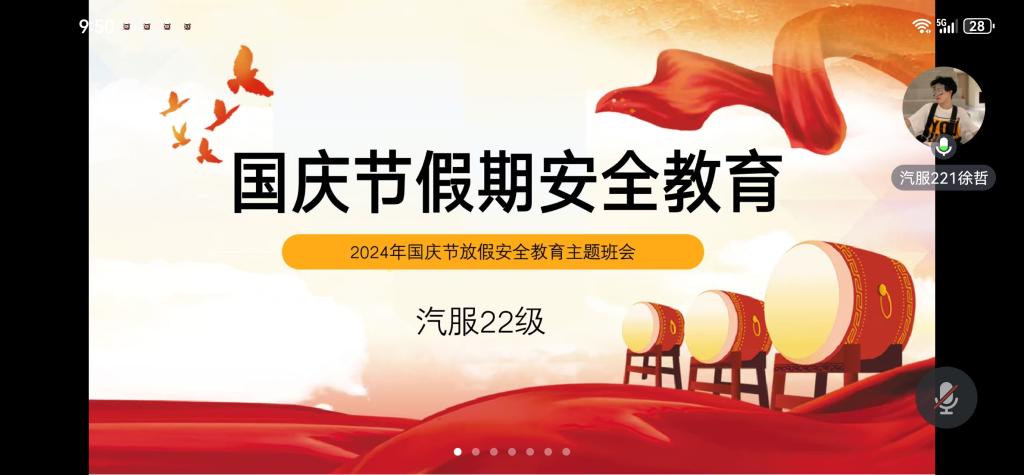 国庆假期即将来临,为切实增强学生的安全防范意识和避险能力,度过一个安全愉快的假期,9月29日在腾讯会议上召开了国庆节假期安全教育主题班会,此次会议由汽服专业辅导员王洪春主持,汽服221班长徐哲讲解,汽服22级全体成员参加。
