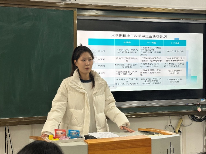 首先由各个部部长向我们介绍各个部门的工作内容及主要职责。然后由学生会主席李孟孟进行补充,无论是系学生会还是校学生会再或者是校内的其他组织,我们都是一个整体,我们的共同目标只有一个就是希望齐齐哈尔工程学院可以越来越好,蓬勃发展,成为培育未来栋梁的摇篮。最后由机电工程系指导老师张勇进行总结,他强调:学联一直以来都在团结和引领广大学生,为学生的成长和发展贡献力量。学联精神强调青年学生要坚定理想信念,把个人的理想追求融入党和国家事业之中,为实现中华民族伟大复兴的中国梦贡献青春力量。