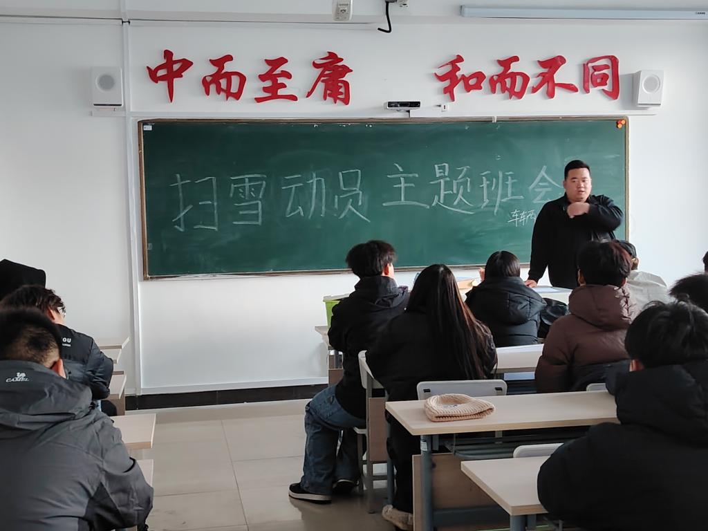 在班会上,辅导员讲了扫雪行动对于校园安全与秩序的重要意义。辅导员与同学们一起探讨高效的扫雪策略与方法,合理分工,为了让扫雪工作更加有条不紊。扫雪不仅是一次体力的付出,更是班级凝聚力与团队精神的考验。