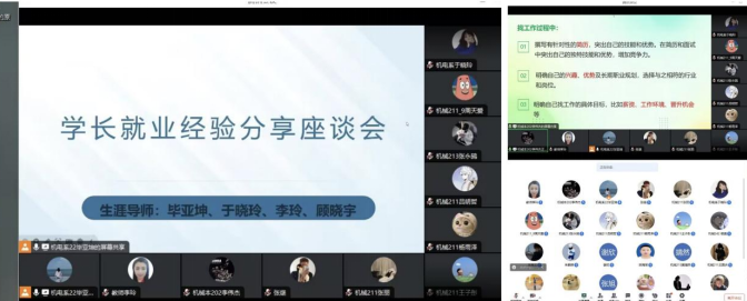 10月27日晚,生涯导师毕亚坤、于晓玲、李玲、顾晓宇在线上组织了一场学长就业经验分享座谈会,旨在帮助21级生涯学生提高就业能力。