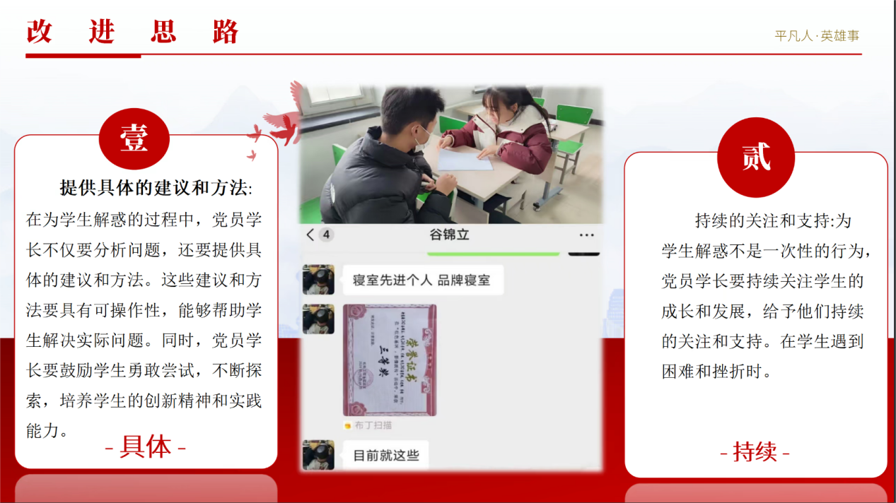 在此基础上,结合学长们前期成立的雏鹰计划宣讲团举办的案例故事分享会,进一步完善自己在工作中的创新与规划,结合自己的经历和实践知识,从具体案例故事分析进行汇报,并分享在新生指导和团队合作方面的经验。还分享了如何将理论知识与实际工作相结合,以及在面对难题时如何进行创新思考和解决。真正做到榜样引领,学风筑梦。