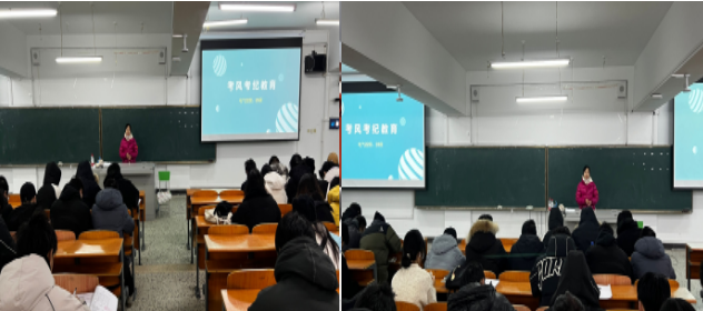 陈迎春提醒学生们务必从思想上加强对考试作弊行为的认识,杜绝此类行为,共同营造良好的考试氛围。陈迎春列举往年违规违纪的案例,使学生们更加清晰地了解到学校对考试监督管理的情况以及对作弊行为的处理办法。接着,组织学生们学习考试违规处理办法等相关文件,通过认真分析以往学生考试违规情况,重点强调了考试作弊的严重后果,告诫学生们要以从容自信的态度面对考试,凭自身实力争取好成绩,学生们才能在大学期间学有所得、顺利毕业。最后,陈迎春还特别强调,学生们不仅要在校内考试中讲诚信,还应严格遵守各类社会考试的相关规定,杜绝学术不端行为,对自己负责,对他人负责。