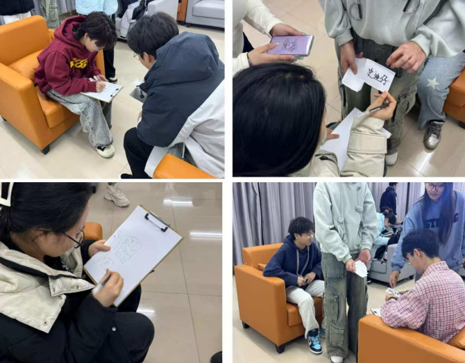 活动规则简单而富有挑战性,参赛队伍由两名同学组成,一人负责根据字条上的词语进行即兴绘画,另一人则需通过观察画作内容猜出词语,用时最短的队伍获胜。活动过程中,不仅参赛队伍之间竞争激烈,观众们的参与热情也十分高涨。大家都积极为参赛队伍加油助威,或参与互动讨论,分享自己的见解与感受。