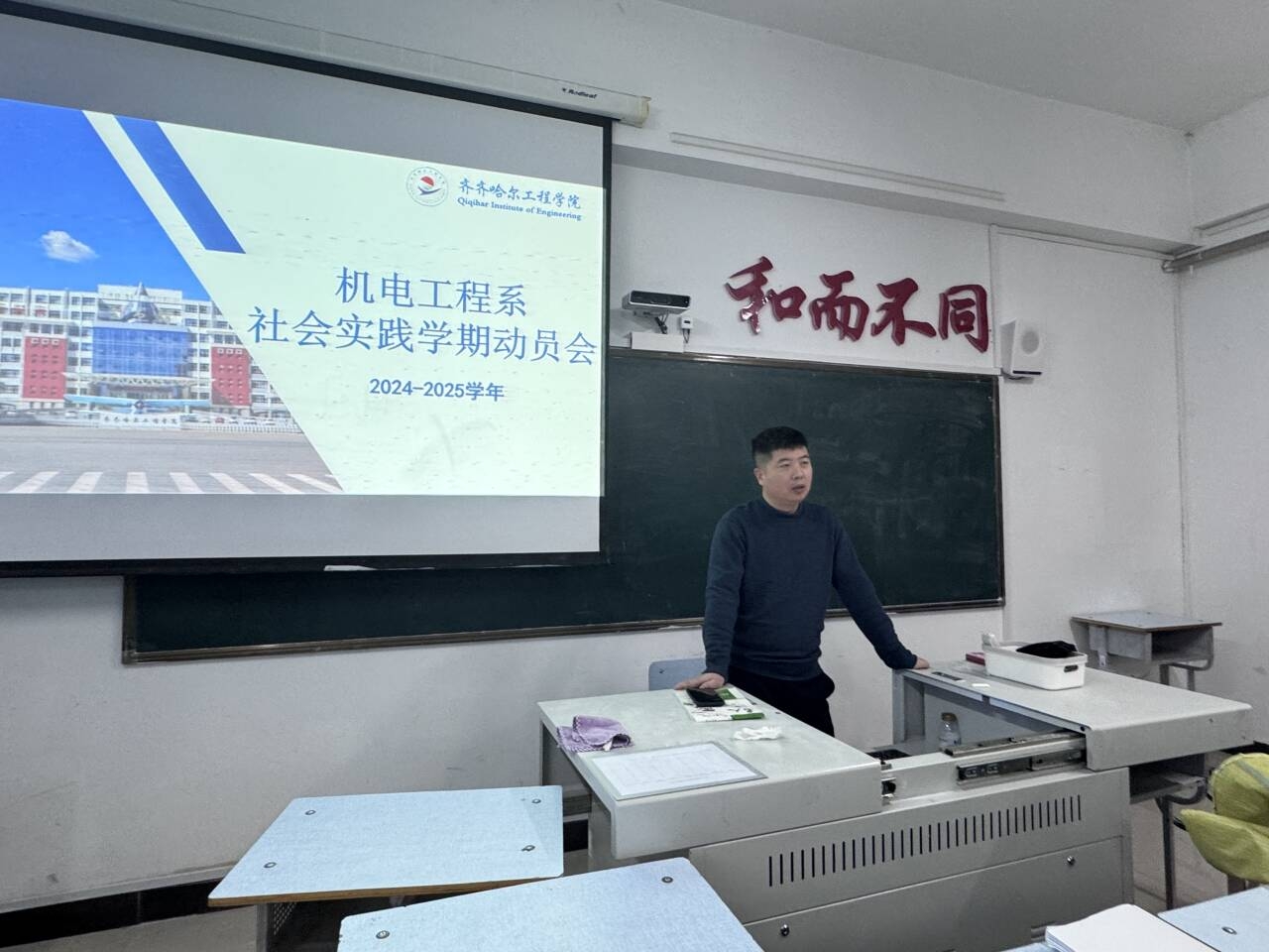 此次班会主要强调了在社会实践学期要完成的任务,共有六条包括必选项目、字帖临摹、读书交流、母校回访、社会调查、志愿服务。张勇鼓励学生要勇于实践,走出理论的象牙塔,深入社会基层。在社会实践学期要完成的任务大多需要团队合作,对此张勇着重强调了团队合作在社会实践中的核心地位。指出在当今复杂多变的社会环境下,任何一项任务的完成都离不开团队成员之间的紧密协作。张勇还强调了在社会实践学期要注重德智体美劳全面发展。