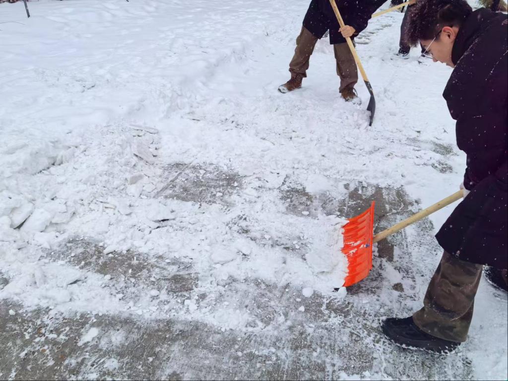 刚刚降雪的天气尤为寒冷,却丝毫没有影响大家扫雪的热情,志愿者们充分发扬不怕苦、不怕累的服务精神,手拿铁锹、雪铲,相互配合,默契十足,遇到出门的居民,志愿者们还提醒他们注意安全。