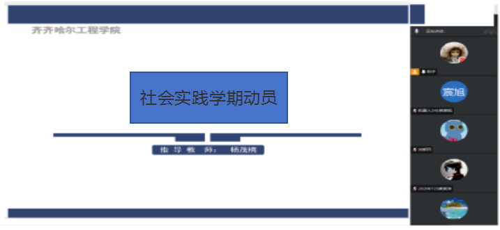 为深入贯彻落实学校社会实践工作部署,引导学生积极参与社会实践,12月28日下午,齐齐哈尔工程学院机电工程学院生涯导师杨茂楠利用腾讯会议召开社会实践学期动员会。全体社会实践学生参加会议。