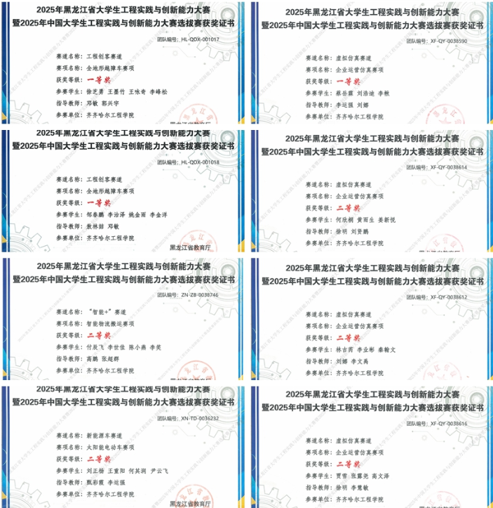 我校参赛团队在指导教师的悉心指导下,以精益求精的态度打磨作品,以默契高效的配合应对挑战,最终在众多强手中脱颖而出,斩获22项省级奖项,充分展现了齐工程学子“重实践、敢创新、善协作”的精神风貌。