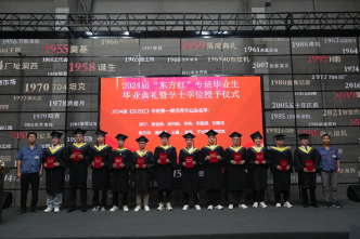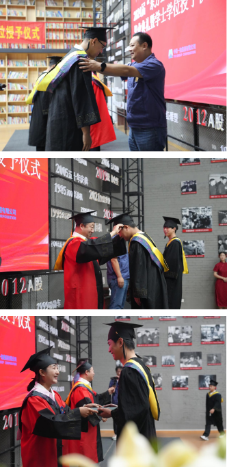 26名毕业生在《加冕进行曲》中依次走上台,院长曹然彬、常务副院长陈景鑫、大拖公司副总经理满孝勇、中小拖公司党委书记、副总经理王彦为毕业生代表正衣冠、扶正流苏、颁发学士学位证书。