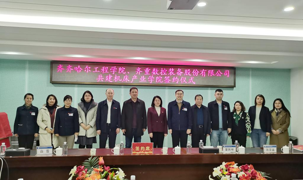 12月13日下午,我校与齐重数控装备股份有限公司共建“机床产业学院”签约揭牌仪式在齐重数控装备股份有限公司举行。齐齐哈尔市龙沙区委常委、组织部部长王扬,齐重数控装备股份有限公司党委书记、董事长王俊峰,总经理孙伟,我校理事长曹勇安、院长曹然彬、副院长白雪、教务处处长张静、创业学院院长陈景鑫及相关部门负责人参加签约仪式。
