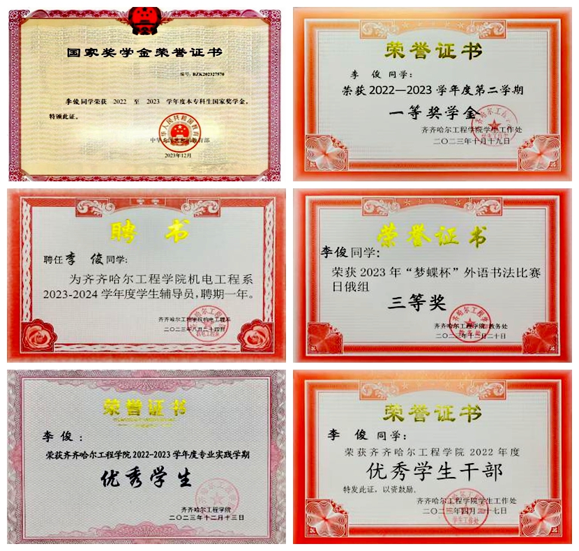 李俊在大二学年时,深知参加竞赛的重要性,他积极报名参加各类比赛,荣获“第29届CaTICs CAD2D(团队赛)国家级”三等奖、“第九届黑龙江省大学生光电设计竞赛”二等奖、“2024年齐齐哈尔工程学院第五届结构创新大赛”二等奖、“节能竞技大赛-绿色节能杯比赛”二等奖。李俊在学习上成绩优秀,获得“齐齐哈尔工程学院2023年度三好学生”“2024丁香奖”“2023年黑龙江省普通高等学校三好学生”,并在专业实践学期中,获得“2023-2024学年度专业实践学期敬业奉献奖”荣誉称号。同时,荣获“2023-2024学年度第一学期一等奖学金”“2023-2024学年度第二学期一等奖学金”“2023-2024学年度本专科生国家奖学金”等多项荣誉,并于2024年12月20日光荣加入中国共产党。