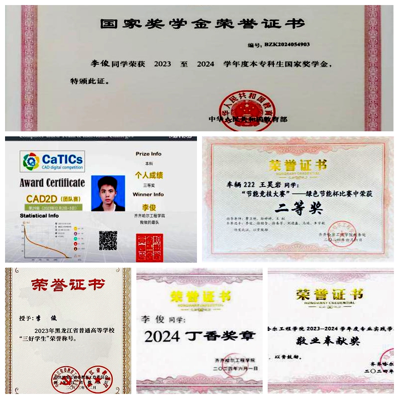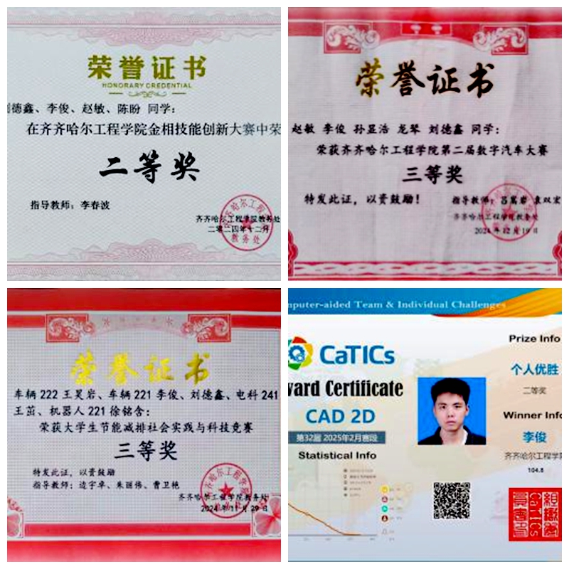 李俊在大三学年依然表现优异,荣获“第32届CaTICs CAD2D(个人赛)”国家级二等奖、“大学生节能减排社会实践与科技竞赛”三等奖、“齐齐哈尔工程学院第二届数字汽车大赛”三等奖、“齐齐哈尔工程学院金相技能创新大赛”二等奖等荣誉。