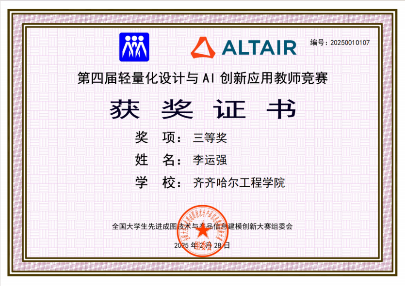 接到比赛通知,李运强老师认真备赛,并在比赛中利用AI技术进行数据优化,构建了无人机机架轻量化模型。最终,经过激烈角逐,荣获得全国三等奖的好成绩。