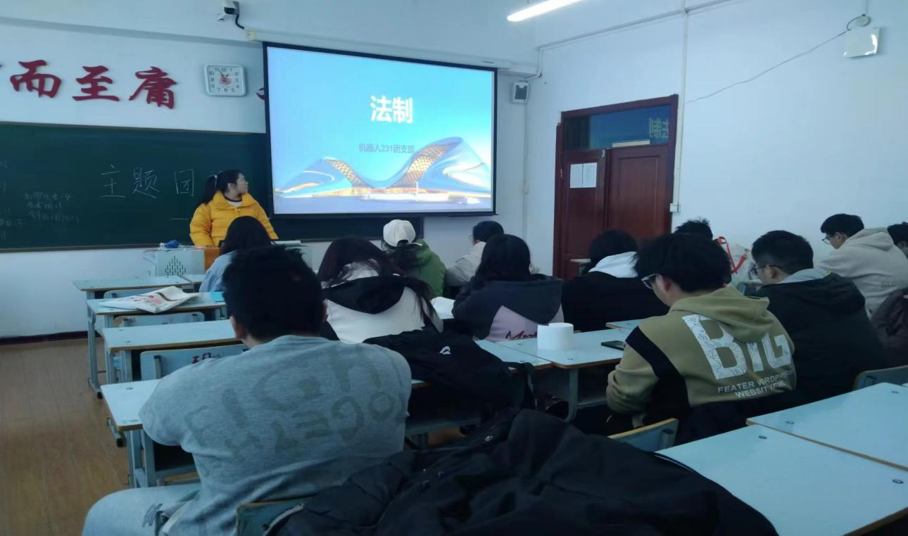 为了培养学生的法治观念和法律意识。3月15日,机器人231班团支书尚效婕在图书馆614东开展了“法制”主题班会,机器人231班20余名同学参加。