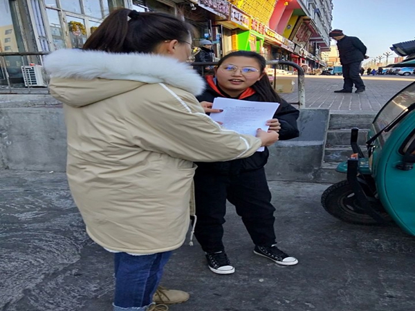 1月11日,我们所有组员在组长何轩皓的带领下,在拜泉县金域名都门口开展了我们此次公益活动。