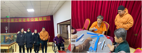 敬老院的老人听说我们又再一次来到这里看望他们,十分高兴。正赶上新年来临之际,准备给给老人举办联欢会。给老人唱唱歌,讲讲笑话,讲段子。入住的老人们和护理员各个争先表演节目,有歌舞、秧歌、歌曲、快板、朗诵诗,还有表演三句半的,整场节目丰富多彩,这些节目都是自编自导自。表演受到老人们极大的喜爱,观众们大声叫好,热情洋溢的氛围让这寒冷的冬天变得暖意绵绵,最后在大家合唱歌曲《好运来》中,联欢会宣告结束。