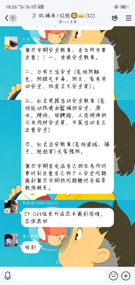 1月10日这天机械本182班开了第四学期第一次网络班会,班会的主要内容是王虹老师对大家进行第四学期安全教育,希望各位同学要注意!一、交通安全教育。二、日常生活安全 (包括防触电、防煤气中毒、防火、家务劳动安全、饮食卫生安全等)。三、社会实践活动安全教育 (包括运动环境和器械的安全、滑冰、游戏、放鞭炮、人流拥挤的公共场所安全等,开展活动自己注意安全)四、社会治安教育(包括盗贼、骗子、抢劫等)大家预防。