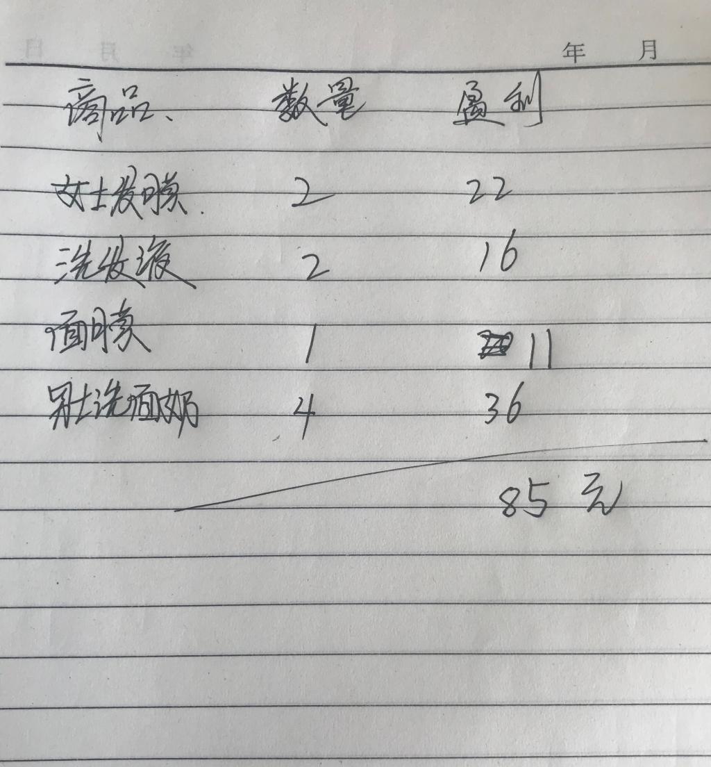 首先小组成员汇报自己的销售情况,组长周俊杰卖出了2套女士发膜盈利22元和1个男士洗面奶盈利9元,组员范庆凯卖出了2瓶洗发液盈利16元,组员李宏增卖出了1套面膜和一个男士洗面奶共盈利20元,组员谢明望卖出了2个男士洗面奶盈利18元。共计盈利85元,虽然不多,但是这是小组成员共同努力的结果,大家都很有成就感,这个寒假很有意义。