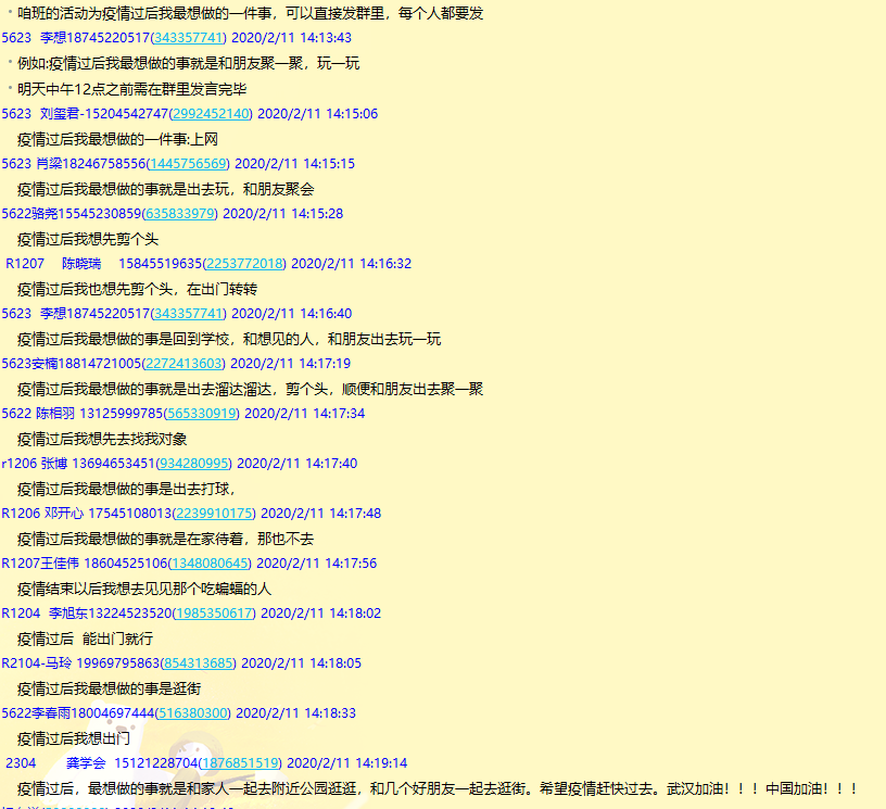 在这次疫情中许许多多的行业纷纷表示财政告急,澳门政府也一次性给与澳门永久居住公民没人1万人民币作为财政支持。大大小小企业也都延时开工,所有的教育工作也都延期开学,在疫情爆发的时候齐齐哈尔工程学院停止了一切外出活动,包括第四学期。我们今天进行了“疫情结束的第一件事,你想做什么”我表示我想剪头,哈哈实在太长了像狮子一样。同学纷纷表示疫情结束后想,吃好吃的,朋友聚餐,看电影,逛街买东西等等,都是些非常简单普通的事情,现在去心有余而力不足。