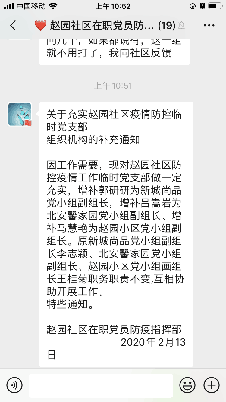 一个支部,一座堡垒;一名党员,一面旗帜。吕嵩岩老师用自己的实际行动践行着一名党员入党时的铮铮誓言,用她的先锋模范作用圆满完成了社区交办的防疫工作。鉴于她的突出表现,赵园社区在职党员防疫指挥部2月13日任命她为社区疫情防控赵园小区北安馨党小组副组长。