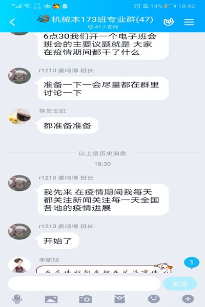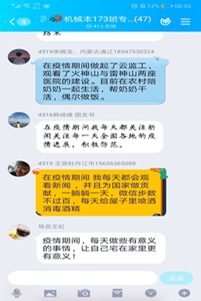 2月13日,辅导员王虹老师和机械本173班班长姜鸣博利用班级QQ群召开了以“抗疫同心同行;我为疫情做贡献”为主题的网络班会。