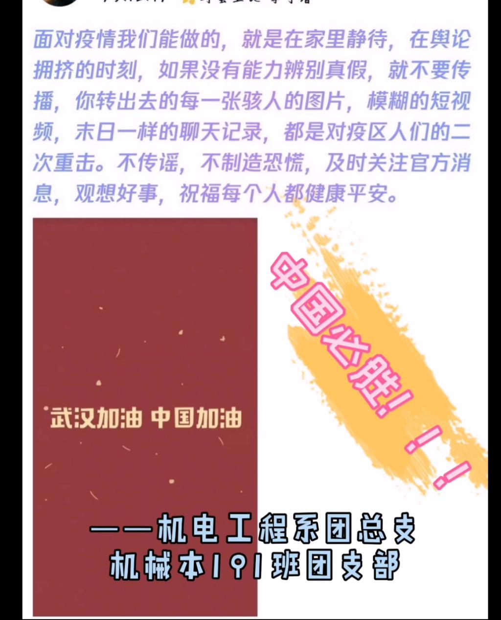 “隔离的是病情,温暖的是真情。”在这个特殊的情况下,为充分发挥机电系学生的作用,并发扬“党有号召、团有行动”的光荣传统。2月13日起机电工程系团总支书记王虹老师就号召各班团干部带领班级同学在微信等网络平台,发表自己的抗疫宣言。