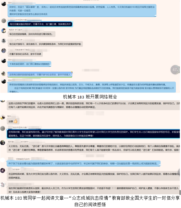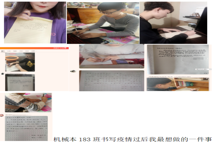 在防疫期间,机械本183班同学们都争做“宅模范”。一是班级同学一起阅读文章--“众志成城抗击疫情”教育部致全国大学生的一封信,并分享了自己的阅读感悟。“做修道者,就是宅其身,抱其道。万物得起本者生,百事得其道者成”。同学们纷纷表示要在假期里利用时间读书、培养兴趣、志愿宣传疫情、防范疫情,同时表达了对“逆行者”的尊敬和感恩。二是在辅导员王虹老师组织下班级同学共同书写:疫情过后我最想做的一件事,并进行合照留念,为祖国加油。有的同学们希望和亲朋好友聚一聚;有的希望把计划中的旅行进行下去;有的想去看看恢复后的武汉,向参加疫情一线的人员送上敬意......都希望经过这次灾难后,中国会变得更加强大。三是要求班级同学在班级群内发一张全家福、我为家人做道菜我为祖国加油等,全家福代表着幸福美满,丰盛的饭菜愿寓意着美好富足的生活愿望,用这种方式将自己的祝福传递给武汉人民和一线工作者。四是按照辅导员王虹的要求,在班长郭旭组织下开展了“疫情就是命令,防控就是责任”网络班会,在会上大家积极发言,把自己对于疫情期间的防控知识和心得进行了分享。五是大家在QQ群分享了这段时间在家读书的感悟,用实际行动来表达对疫情防控的支持。