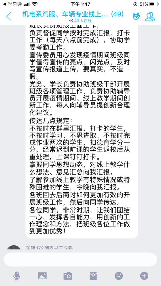 汽服、车辆专业线上教学自主管理委员会于3月1日正式成立,委员会成员由九个班级的学生党员、学长、班长、团支书、学习委员、宣传委员48人组成。由董老师负责布置工作,分配任务。会上董老师传达了学院在上网课期间的具体要求和学习任务,要求同学们保证上网课的时间和学习质量;对于不按时打卡的同学的处理方式,还希望成员们在向同学传达工作的过程中找到高效的工作方法。委员会成员们充分认识到自己工作的重要,积极回复董老师的工作安排,并了解具体工作职责。董老师还向同学们了解大家的思想动态和对线上教学的想法,希望委员会的成员及班级同学向他提出创新合理的意见。