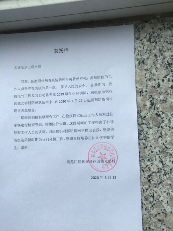 机电系3月13日收到林甸县花园镇光明村发来的感谢信,信中表扬电气192班郝钥榕同学能在疫情防控这关键时刻为村里分担工作,是学校培养出的优秀学生。