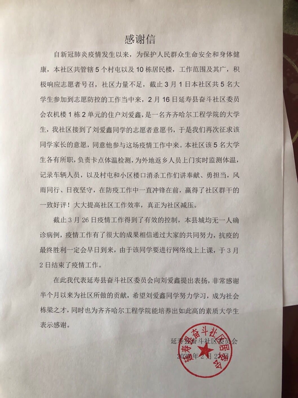 信中说自新冠状病毒疫情发生以来,为维护人民群众生命安全,延寿县奋斗社区的5个村屯10栋楼进行防疫工作范围广、任务重,社区力量不足。2月16日接到刘爱鑫志愿者意愿书,分配他负责卡点检测过往人员、车辆。还要协助工作人员上门为返乡人员量体温、进行村屯和楼道消毒工作。刘爱鑫在抗疫工作中,讲奉献、勇担当、风雨同行、日夜坚守,一直冲锋在前,赢得社区居民的一致好评。截止3月26日疫情得到了有效控制,县域无一人确诊病例,防控工作任务也有所减轻,刘爱鑫从3月2日开始上课,不再做志愿者工作。