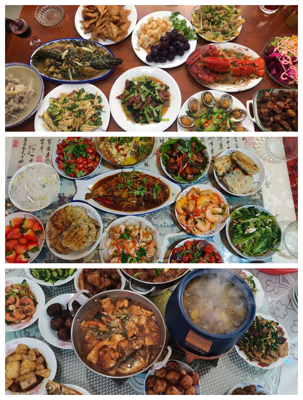 五彩缤纷的烟花绚烂在漆黑的夜空,映红了大地,也映红了天空。我们小组作业周礼同学和家人一起做年夜饭,他做的菜品是图一中的红烧肉和炖鲟鱼,在自己的资料查询和父母指导下完成了这两个菜品。图二中的这些菜品是组员庞迎梅独自完成的,第一次由自己掌管家庭年夜饭,将自己能做的做到最好,提前买好食材学习菜谱,感恩父母,给他们放一次除夕假。图三是组员张景录在家人的帮助下完成的年夜饭每个家庭成员都在年夜饭中付出了努力,最后完成这美味的家庭年夜饭。