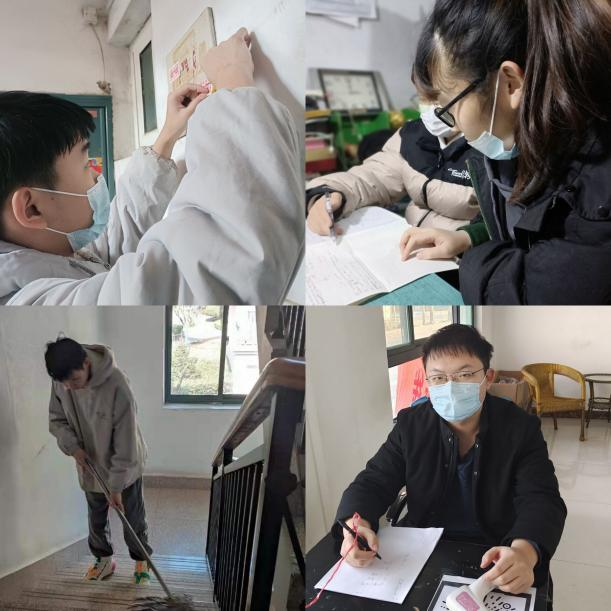 李庆霖同学于2月8日做好防疫措施,在山东省济南市历城区东风街道义务为社区楼道清理小广告。樊锐同学于2月12日在山东省聊城市冠县宏宇检测站进行核酸检测检查工作,为来往行人检查返乡是否有核酸检测报告。李长甜同学于2月9日在山东省济宁市王因街道村内对邻居家中学生辅导高中数学题。邓文吉同学于2月14日于山东省日照市莒县城阳街道锦苑小区进行单元楼道内的清扫,让居住环境更加整洁。