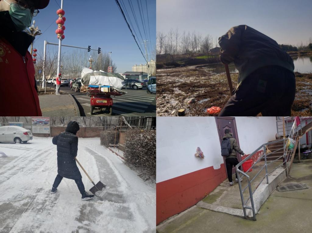 王少卿同学来到了交警大队进行社会实践工作,在警员的带领下我来到本市最拥挤的路口之一进行交通疏导。梅永继将农村的河流中的垃圾进行清理,防止进一步污染。赵英杰同学则在自家小区进行了道路积雪扫除。朱继鹏同学帮助小区年迈的老人处理厨余垃圾。