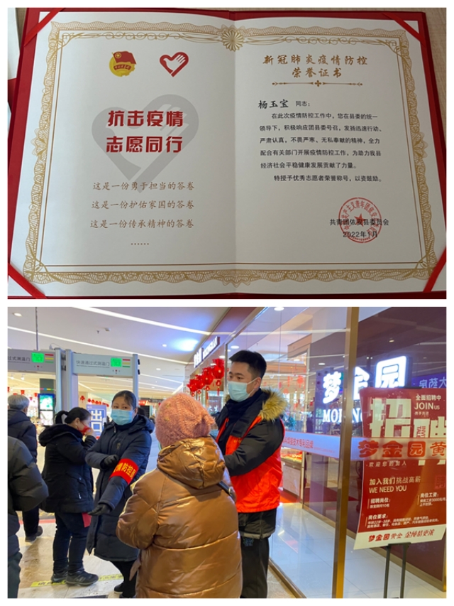 今年第四学期期间,得知家乡依安县在组织“返乡大学生志愿服务——依安县疫情防控”, 杨玉宝毫不犹豫报了名,把这次活动作为一次服务社会、提升自我能力的机会。根据当地团县委统一部署,杨玉宝被分配到了县“华晨广场”值守。在农历新年前夕商场人流量非常大,他的主要工作是引导客人扫码、测温、戴口罩,帮助没有手机的老人进行登记,维持秩序等。虽然所做的是些小事,但是关乎着全县人民安全,他时刻提高警惕,认真值岗。他说,能为家乡贡献自己一份力量,再苦也值得。