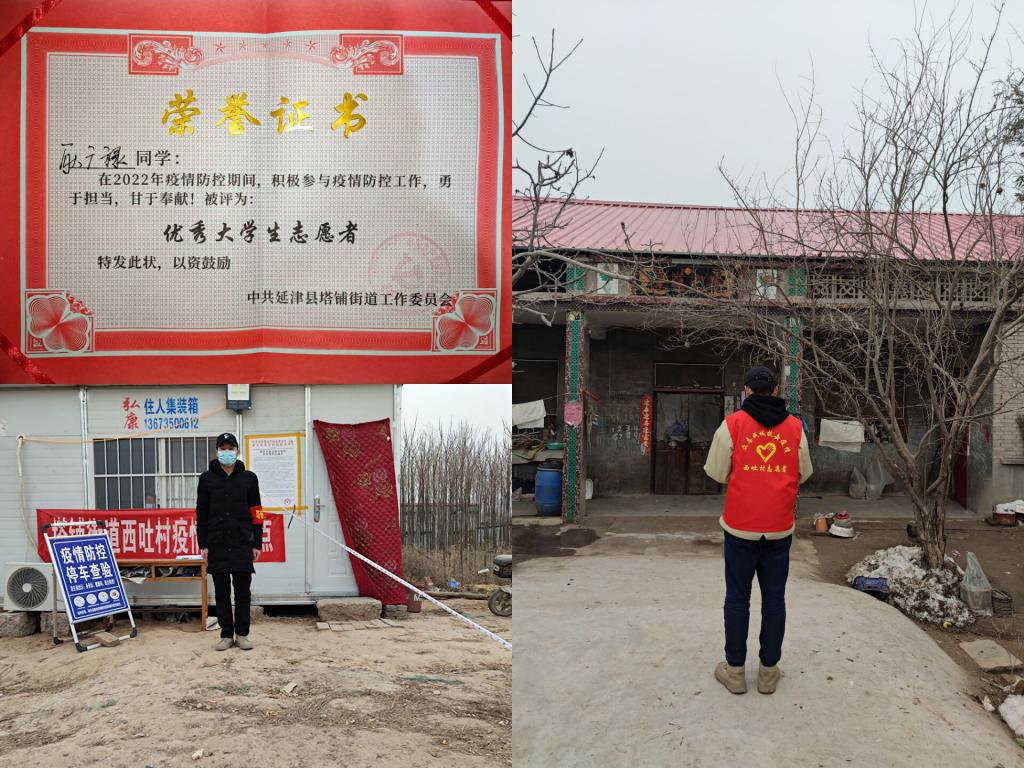 我们没有防护服,穿上红马甲,带好医用口罩,就能投身疫情防控第一线,跟随村中的领导干部和党员在疫情防控卡点立岗值勤,对过往车辆和人员进行登记,做好测温扫码工作,防止疫情扩散,不怕寒风凛冽,胸怀一腔热血和激情,只为奉献自己的青春力量。同时耿广禄同学身为入党积极分子,在家乡河南疫情形势严峻时,时刻坚守疫情防控第一线,不忘初心,牢记使命,积极向身边的党员先锋学习,做好疫情防控工作,以党员的标准来要求自己,期间荣获乡里颁发的“优秀大学生志愿者”。其间,耿广禄同学在河南省房屋信息普查录入工作中,和村中其他志愿者走街串巷,挨家挨户走访排查,讲明政策,精准做好房屋信息普查工作,确保不漏一户;李逸同学在家乡江西跟随环卫工一起清扫大街上的积雪,不怕严寒,向基层劳动人民传递了热心关怀;邬德军同学在新年来临之际,看望慰问村中的空巢老人和留守儿童,给予他们最亲切的关爱。