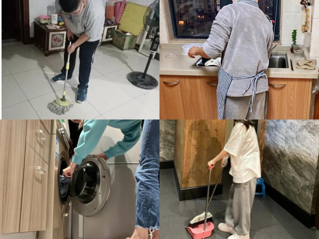 作为家庭的一员,理应帮父母做一些力所能及的家务。他们帮助父母扫地、刷碗、洗衣服、扫地等等,他们样样都尝试。当看到自己把家里打扫干净的时候,他们都十分满意。这次家务劳动让他们体会到了父母平日的辛苦,也让他们下定决心,要经常都帮父母做家务,为他们的小家付出自己的力量,共同努力,让家更好、更温馨。
