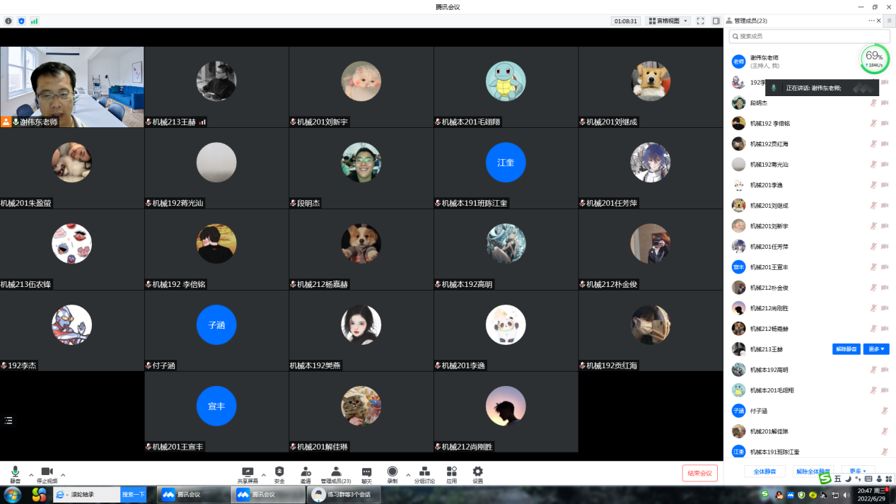 6月29日晚8:30分,谢伟东组织了三个年级23名生涯学生召开了线上座谈会,座谈中谢老师就实习安全、实习中出现的心理焦躁问题、实习中应培养的劳动意识和正确的劳动态度、在实习岗位上所培育的职业道德等方面进行了交流,为同学们解开了实习过程中产生的疑惑。